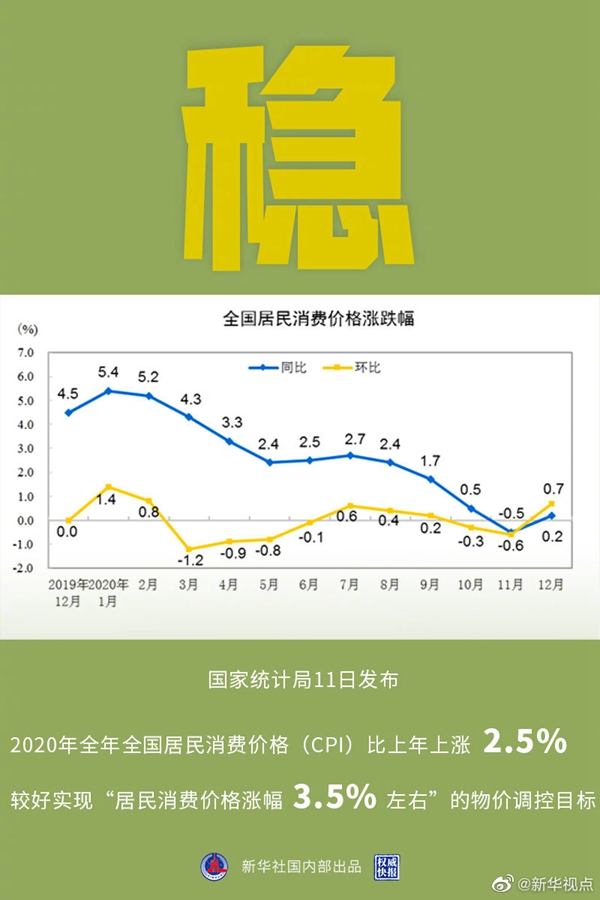物價穩(wěn)!2020年CPI同比上漲2.5%
