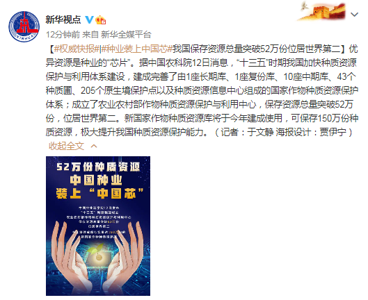 優(yōu)異資源是種業(yè)的“芯片”。據(jù)中國農(nóng)科院12日消息,“十三五”時期我國加快種質(zhì)資源保護(hù)與利用體系建設(shè),建成完善了由1座長期庫、1座復(fù)份庫、10座中期庫、43個種質(zhì)圃、205個原生境保護(hù)點以及種質(zhì)資源信息中心組成的國家作物種質(zhì)資源保護(hù)體系;成立了農(nóng)業(yè)農(nóng)村部作物種質(zhì)資源保護(hù)與利用中心,保存資源總量突破52萬份,位居世界第二。新國家作物種質(zhì)資源庫將于今年建成使用,可保存150萬份種質(zhì)資源,極大提升我國種質(zhì)資源保護(hù)能力。(記者:于文靜 海報設(shè)計:賈伊寧)