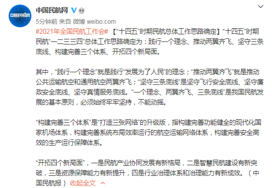 上證報中國證券網(wǎng)訊 據(jù)中國民航網(wǎng)微博消息,1月12日,2021年全國民航工作會議、全國民航安全工作會議以視頻形式在京召開。會上傳出的消息稱,“十四五”時期民航“一二三三四”總體工作思路確定為:踐行一個理念、推動兩翼齊飛、堅守三條底線、構(gòu)建完善三個體系、開拓四個新局面。