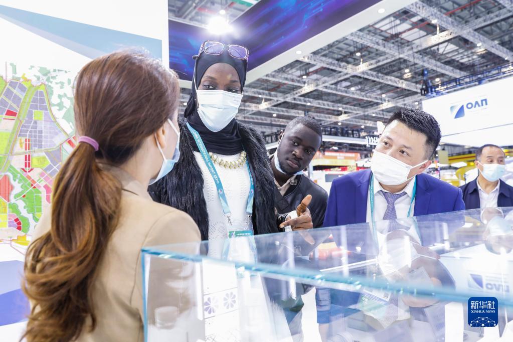 11月7日,來自岡比亞的參觀者(中)在進博會服務(wù)貿(mào)易展區(qū)中白工業(yè)園展臺了解參展商品。