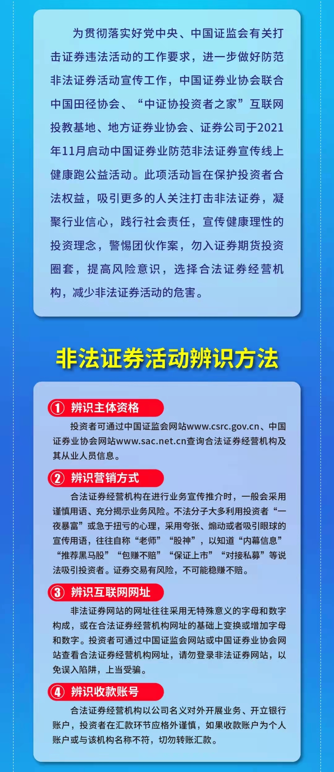 據(jù)悉,此項(xiàng)活動(dòng)旨在保護(hù)投資者合法權(quán)益,吸引更多的人關(guān)注打擊非法證券,凝聚行業(yè)信心,踐行社會(huì)責(zé)任,宣傳健康理性的投資理念,警惕團(tuán)伙作案,勿入證券期貨投資圈套,提高風(fēng)險(xiǎn)意識(shí),選擇合法證券經(jīng)營(yíng)機(jī)構(gòu),減少非法證券活動(dòng)的危害。