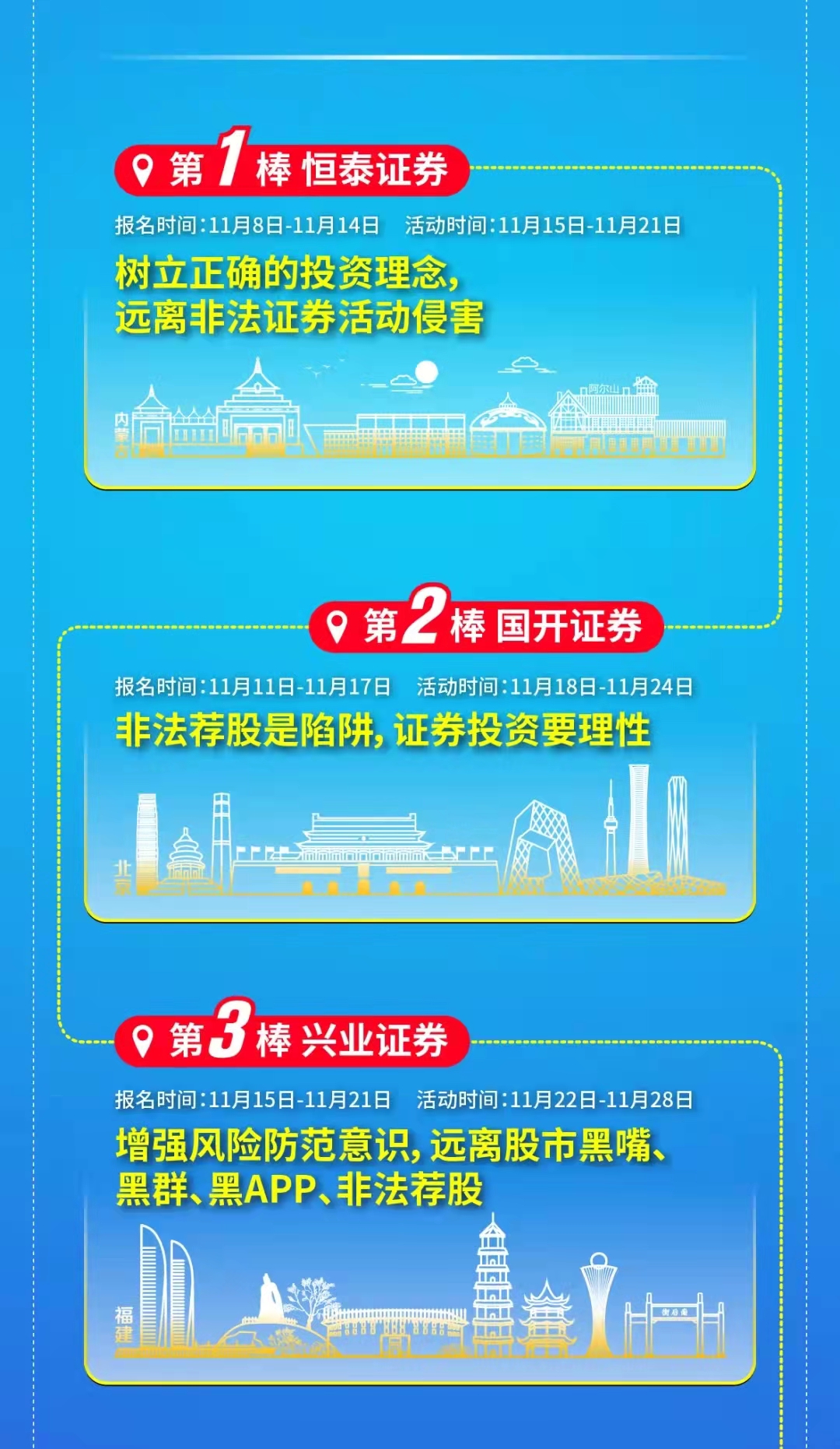 據(jù)協(xié)會(huì)披露,本次活動(dòng)將有8家券商接棒參與,分別是恒泰證券、國(guó)開證券、興業(yè)證券、中國(guó)銀河證券、國(guó)信證券、國(guó)泰君安證券、華安證券和開源證券,活動(dòng)時(shí)間為11月15日至12月19日。