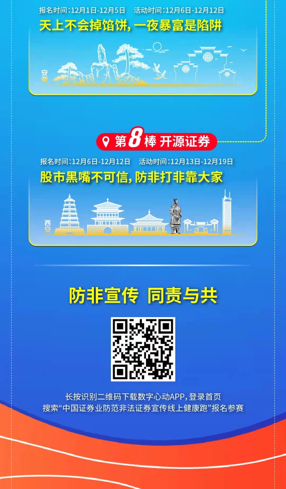 中證網(wǎng)訊(記者 胡雨)2021年中國(guó)證券業(yè)防范非法證券宣傳線上健康跑活動(dòng)日前正式啟動(dòng)。據(jù)中國(guó)證券業(yè)協(xié)會(huì)消息,為貫徹落實(shí)好黨中央、中國(guó)證監(jiān)會(huì)有關(guān)打擊證券違法活動(dòng)的工作要求,進(jìn)一步做好防范非法證券活動(dòng)宣傳工作,中國(guó)證券業(yè)協(xié)會(huì)聯(lián)合中國(guó)田徑協(xié)會(huì)、“中證協(xié)投資者之家”互聯(lián)網(wǎng)投教基地、地方證券業(yè)協(xié)會(huì)、證券公司于2021年11月啟動(dòng)中國(guó)證券業(yè)防范非法證券宣傳線上健康跑公益活動(dòng)。