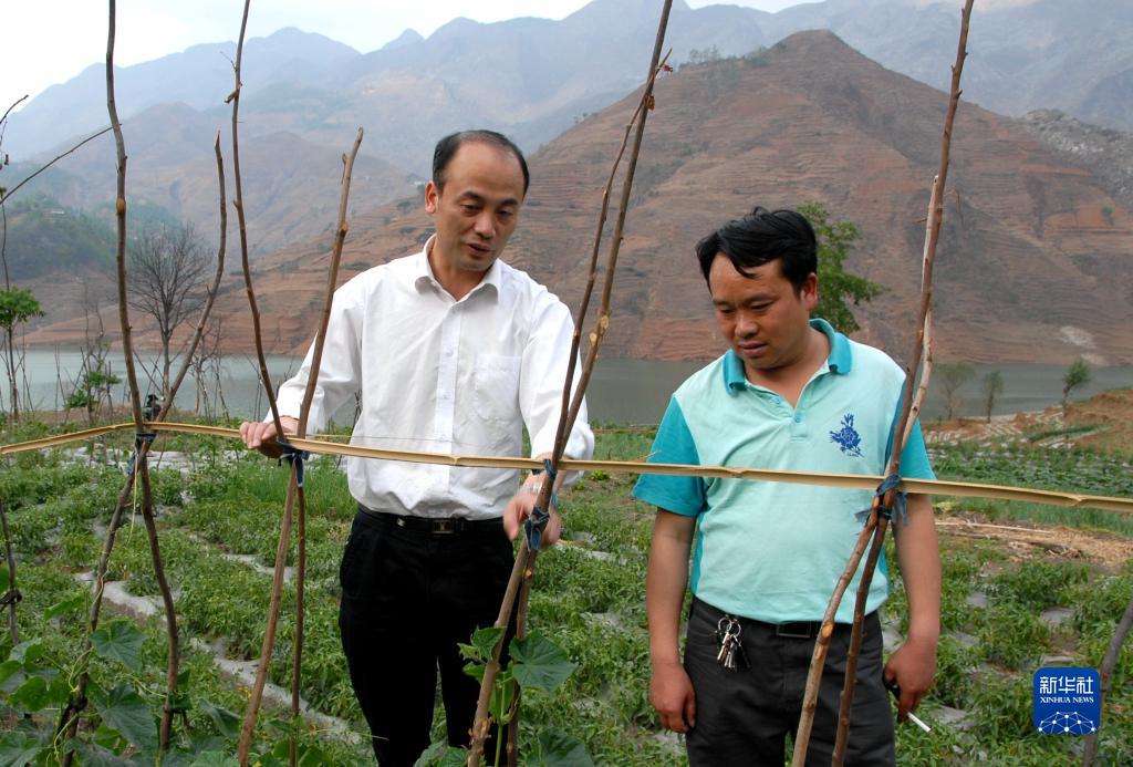 姜仕坤(左)在貴州晴隆縣長流鄉(xiāng)與村民交流(資料照片)。新華社發(fā)