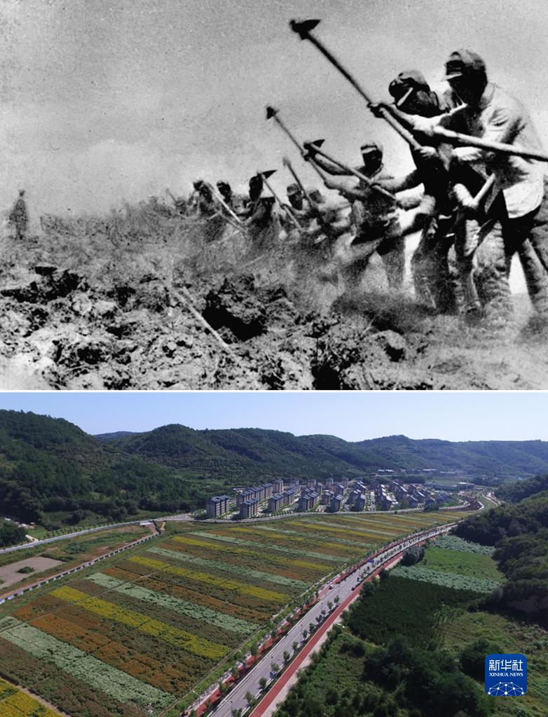 這是一張拼版照片,上圖為:抗日戰(zhàn)爭期間,八路軍三五九旅在南泥灣開荒生產(chǎn)(資料照片);下圖為:2020年8月25日拍攝的延安南泥灣景色(無人機照片,祁小軍攝)。新華社發(fā)