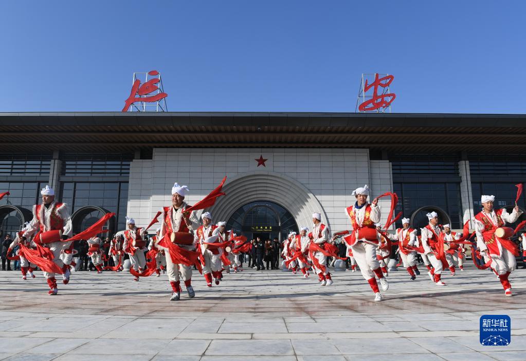 陜西延安南泥灣機場正式通航,演員在南泥灣機場進行通航慶祝表演(2018年11月8日攝)。新華社記者 張博文 攝