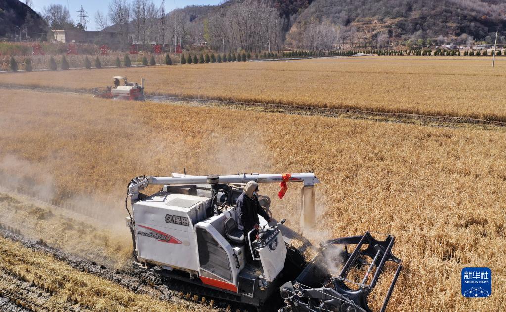 收割機在延安市南泥灣鎮(zhèn)收割水稻(2020年10月23日攝,無人機照片)。新華社記者 陶明 攝