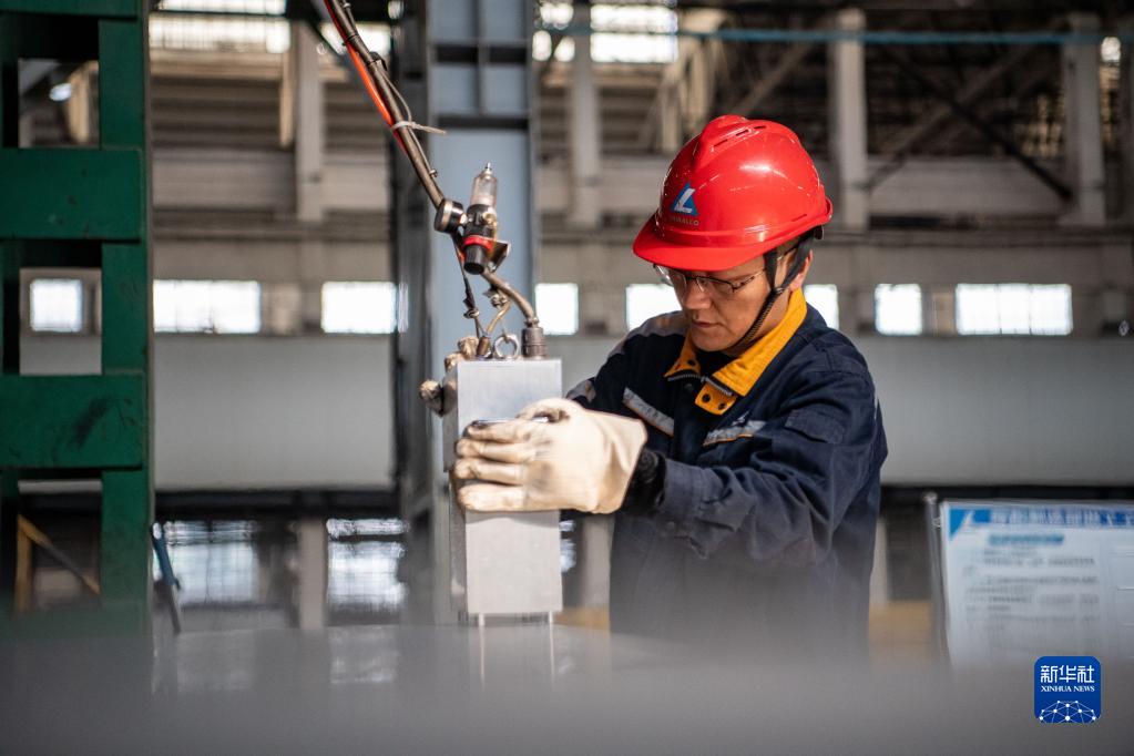 1月31日,在西南鋁業(yè)(集團)有限責(zé)任公司生產(chǎn)車間,工人操作機械設(shè)備進行生產(chǎn)作業(yè)。新華社記者 唐奕 攝