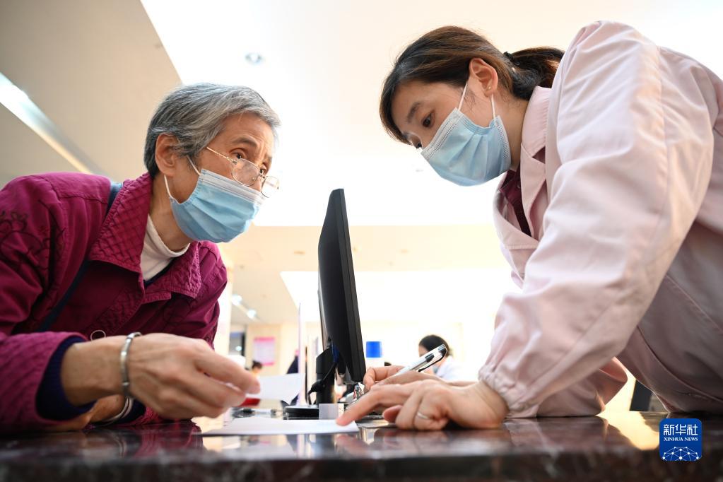福建省三明市第一醫(yī)院的醫(yī)保辦工作人員(右)向前來咨詢藥品報(bào)銷問題的居民講解相關(guān)政策(2020年11月18日攝)。新華社記者 姜克紅 攝