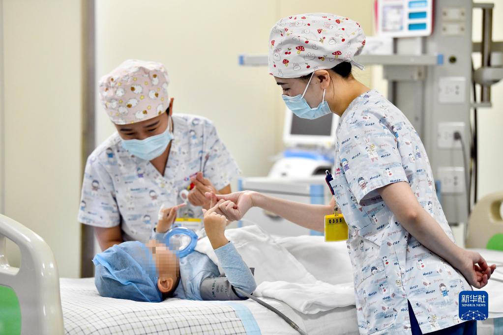 在山東省棗莊市婦幼保健院兒童ICU病房,醫(yī)護(hù)人員為完成靶向治療藥物諾西那生鈉的4歲脊髓性肌萎縮癥患兒加油鼓勁(1月1日攝)。諾西那生鈉注射液是我國首個(gè)獲批治療脊髓性肌萎縮癥的進(jìn)口藥物,2019年進(jìn)入中國市場時(shí),每針價(jià)格近70萬元。在2021年國家醫(yī)保目錄藥品談判中,以3.3萬元每針的價(jià)格進(jìn)入新版醫(yī)保藥品目錄。新華社記者 郭緒雷 攝