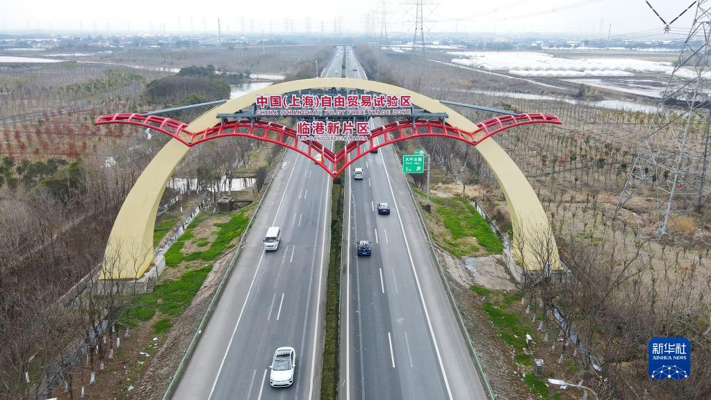 S2滬蘆高速上的中國(上海)自由貿(mào)易試驗(yàn)區(qū)臨港新片區(qū)“海鷗門”(2月10日攝,無人機(jī)照片)。新華社記者 方喆 攝