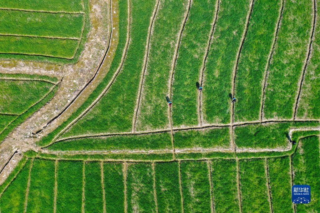 3月9日,浙江省寧波市鄞州區(qū)東吳鎮(zhèn)天童村村民在田間管護(hù)農(nóng)作物(無人機(jī)照片)。新華社發(fā)(胡學(xué)軍 攝)