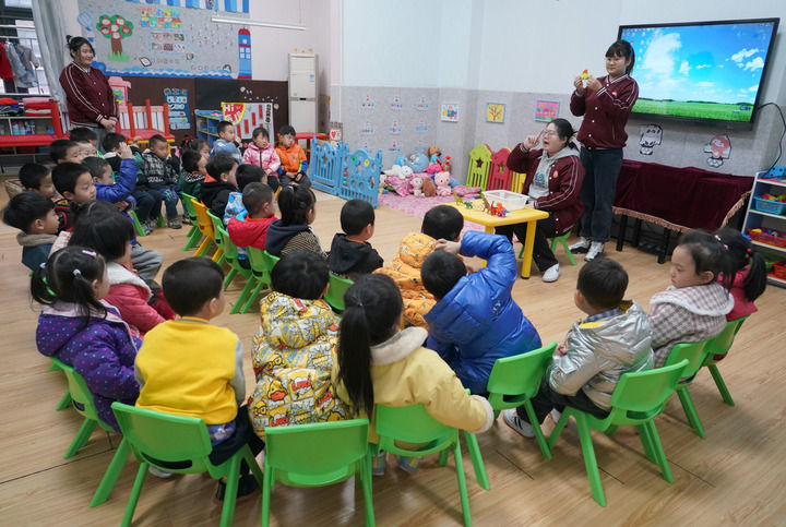 2022年3月2日,在西安市蓮湖區(qū)愛爾堡幼兒園,中一班的9名聽障兒童與健全兒童在一起上課。新華社記者 邵瑞 攝