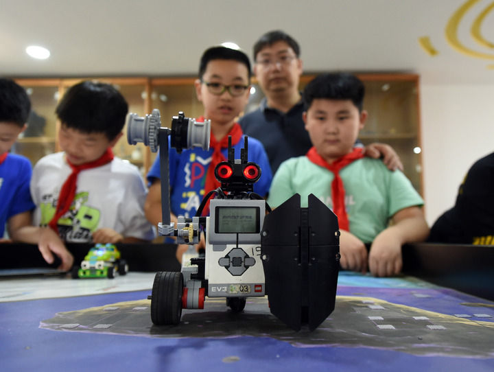 在合肥市和平小學,信息技術(shù)老師楊森(右二)在“課后三點半”時間指導機器人社團的學生(2021年9月8日攝)。新華社記者 周牧 攝