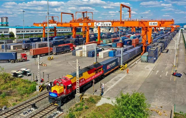 圖為從成都國際鐵路港發(fā)出的開往英國費(fèi)利克斯托的中歐班列(無人機(jī)照片)。新華社圖片