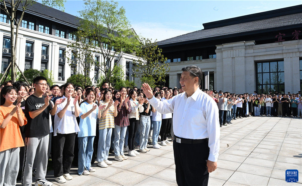 6月8日,中共中央總書記、國家主席、中央軍委主席習近平在四川考察。這是8日下午,習近平在宜賓學院考察時,向師生們揮手致意。新華社記者 李學仁 攝