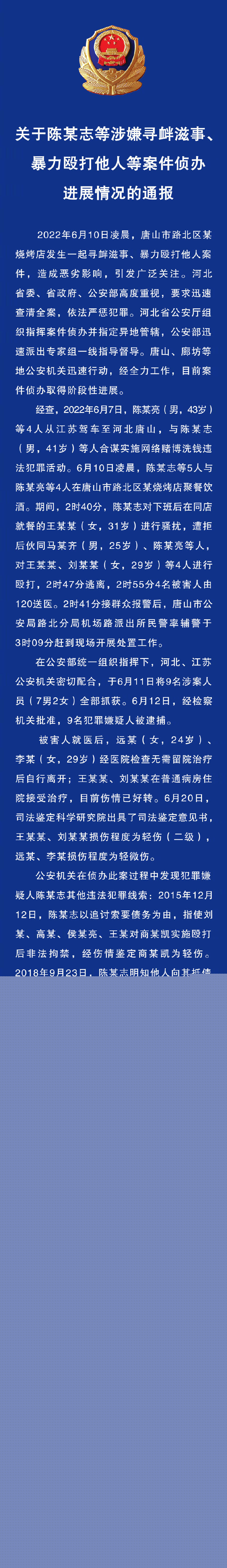 河北省公安廳:關(guān)于陳某志等涉嫌尋釁滋事、暴力毆打他人等案件偵辦進(jìn)展情況的通報(bào)