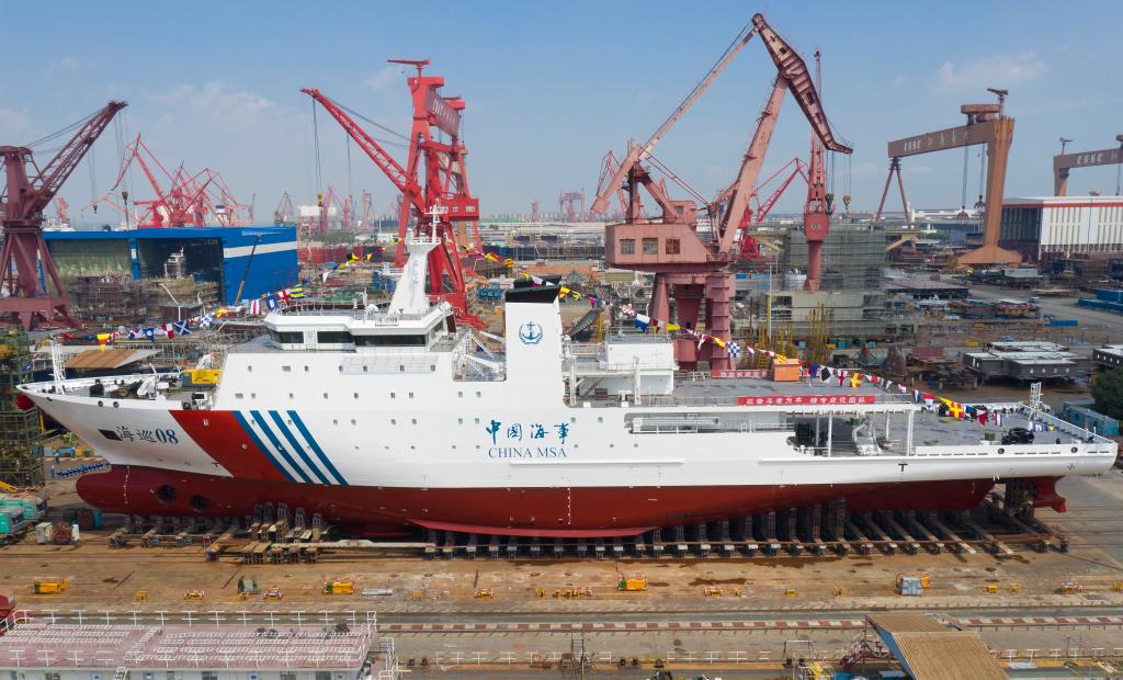 7月8日拍攝的“海巡08”輪(無人機照片)。當日,我國具備深遠海測量能力的專業(yè)海道測量船“海巡08”輪在中國船舶集團有限公司下水。新華社記者 丁汀 攝