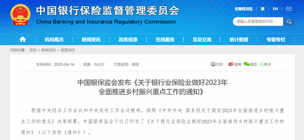 根據(jù)中央經(jīng)濟(jì)工作會議和中央農(nóng)村工作會議精神,按照《中共中央 國務(wù)院關(guān)于做好2023年全面推進(jìn)鄉(xiāng)村振興重點(diǎn)工作的意見》決策部署,中國銀保監(jiān)會于近日印發(fā)了《關(guān)于銀行業(yè)保險(xiǎn)業(yè)做好2023年全面推進(jìn)鄉(xiāng)村振興重點(diǎn)工作的通知》(以下簡稱《通知》)。