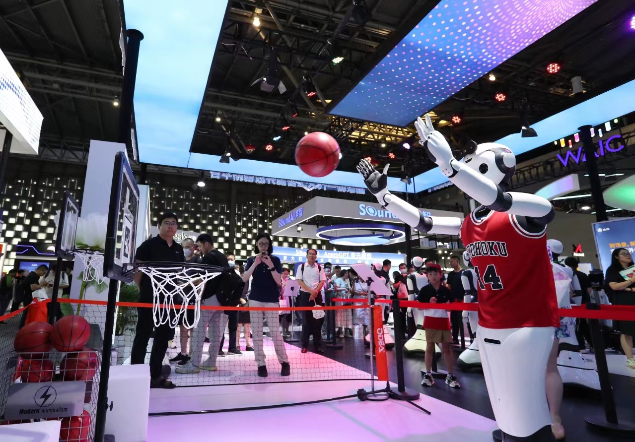 7月6日,一個機(jī)器人在2023世界人工智能大會展會現(xiàn)場進(jìn)行投籃表演。 新華社圖片