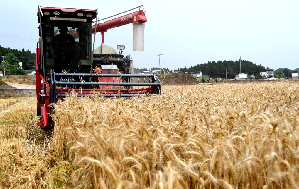 5月11日,在四川省德陽市中江縣永太鎮(zhèn)石獅村,一臺(tái)收割機(jī)正在收小麥。新華社記者高健鈞 攝
