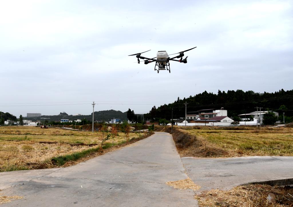 5月11日,在四川省德陽市中江縣永太鎮(zhèn)石獅村,一臺(tái)無人機(jī)正在作業(yè)。新華社記者高健鈞 攝