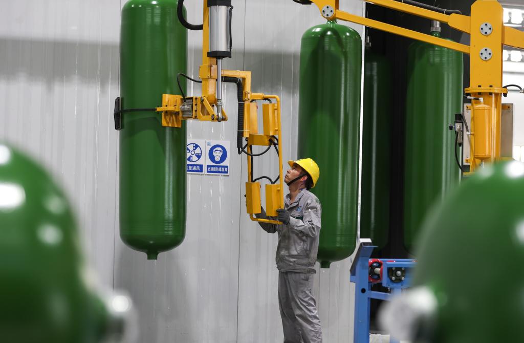 ??5月31日,一名工作人員在江蘇國富氫能技術(shù)裝備股份有限公司的儲氫罐生產(chǎn)車間內(nèi)作業(yè)。新華社記者 楊磊 攝