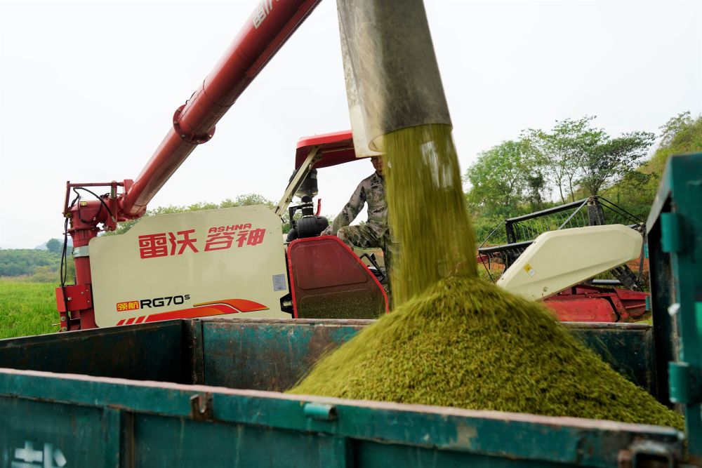農(nóng)機(jī)手在湖南省靖州苗族侗族自治縣甘棠鎮(zhèn)溪口村將收割的制種水稻裝車。新華社記者 余春生 攝