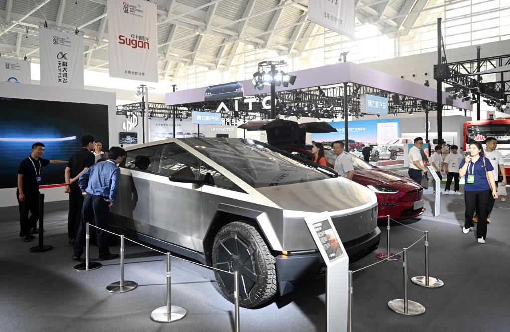 ??6月20日,參觀者在博覽會(huì)智能網(wǎng)聯(lián)汽車展區(qū)參觀特斯拉皮卡車。新華社記者 趙子碩 攝
