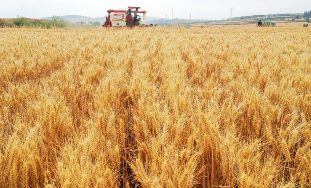 ??5月27日,收割機(jī)在河南省洛陽(yáng)市新安縣鐵門鎮(zhèn)的麥田里收獲小麥。新華社發(fā)(張怡熙攝)