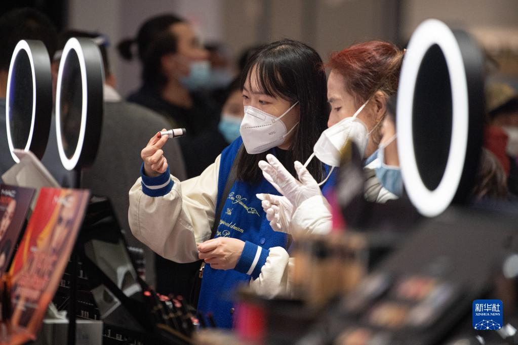 1月29日,消費者在中免集團?谌赵聫V場免稅店選購化妝品。 新華社記者 蒲曉旭 攝