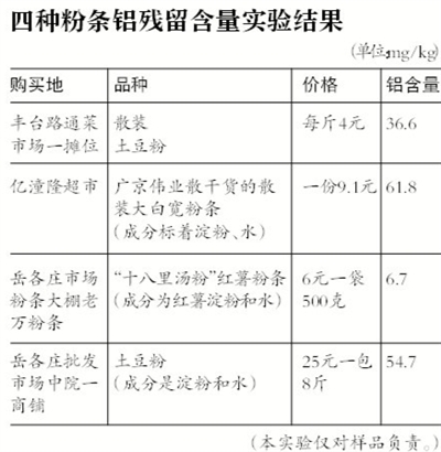實驗結果顯示,4種樣品粉條中3種鋁含量偏高;專家稱,明礬粉條會造成人體攝入鋁過量、智力下降等