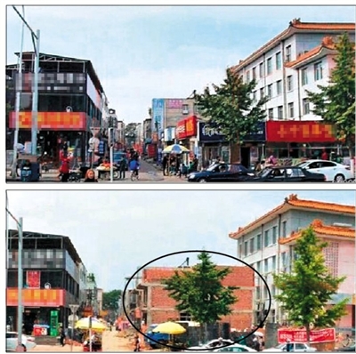 2013年10月北京某地街景照片(上圖)。2014年7月,在該地的街景照片中出現(xiàn)了一處紅磚建筑(下圖,圈中)。“打違專指辦”供圖
