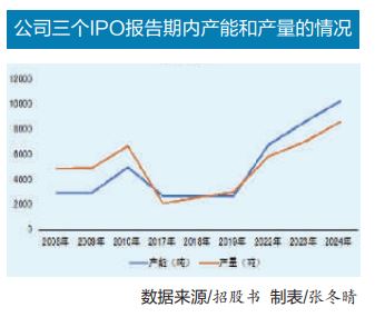 但2020年版招股書則顯示,2017年至2019年期間,公司基本維持在2700多噸的產(chǎn)能,僅為2010年產(chǎn)能的50%多。