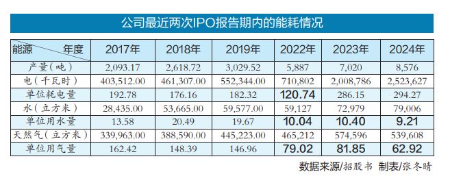 根據(jù)招股書,公司2022年的單位耗電量畸低,2023年和2024年的單位耗電量卻又遠(yuǎn)高于2017年至2019年的水平。2022年至2024年期間單位用水量和單位用氣量也僅為2017年至2019年均值的50%左右。