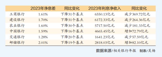 這在國有六大銀行2023年報中有所體現(xiàn)。數(shù)據(jù)顯示,六大銀行凈息差均出現(xiàn)不同程度同比下降。其中,郵儲銀行是唯一一家凈息差超過2%的國有大行,為2.01%,較上年下降19個基點。工商銀行、建設(shè)銀行、農(nóng)業(yè)銀行、中國銀行、交通銀行凈息差分別為1.61%、1.70%、1.60%、1.59%、1.28%,分別比上年下降31個、31個、30個、16個、20個基點。