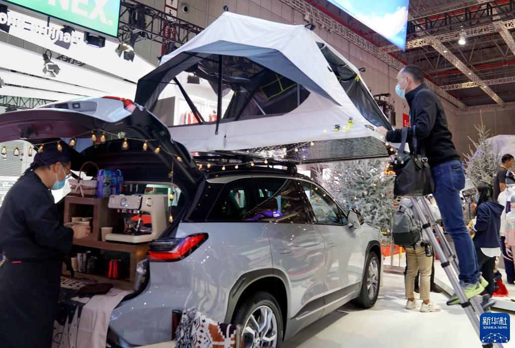 11月6日,參觀者在進(jìn)博會(huì)展館里參觀車頂帳篷。