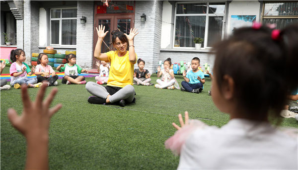 幼教老師在遼寧省鳳城市大梨樹(shù)村萌芽幼兒園里帶領(lǐng)孩子們游戲(2020年9月9日攝)。新華社記者 姚劍鋒 攝