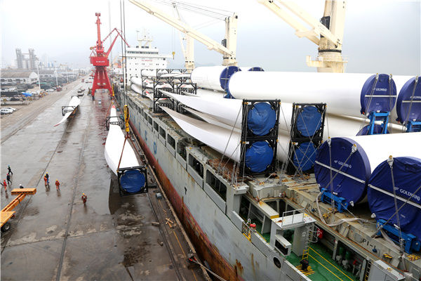 2月28日,一艘貨輪在江蘇連云港港東方公司碼頭裝載風(fēng)力發(fā)電設(shè)備。新華社發(fā)(王春 攝)