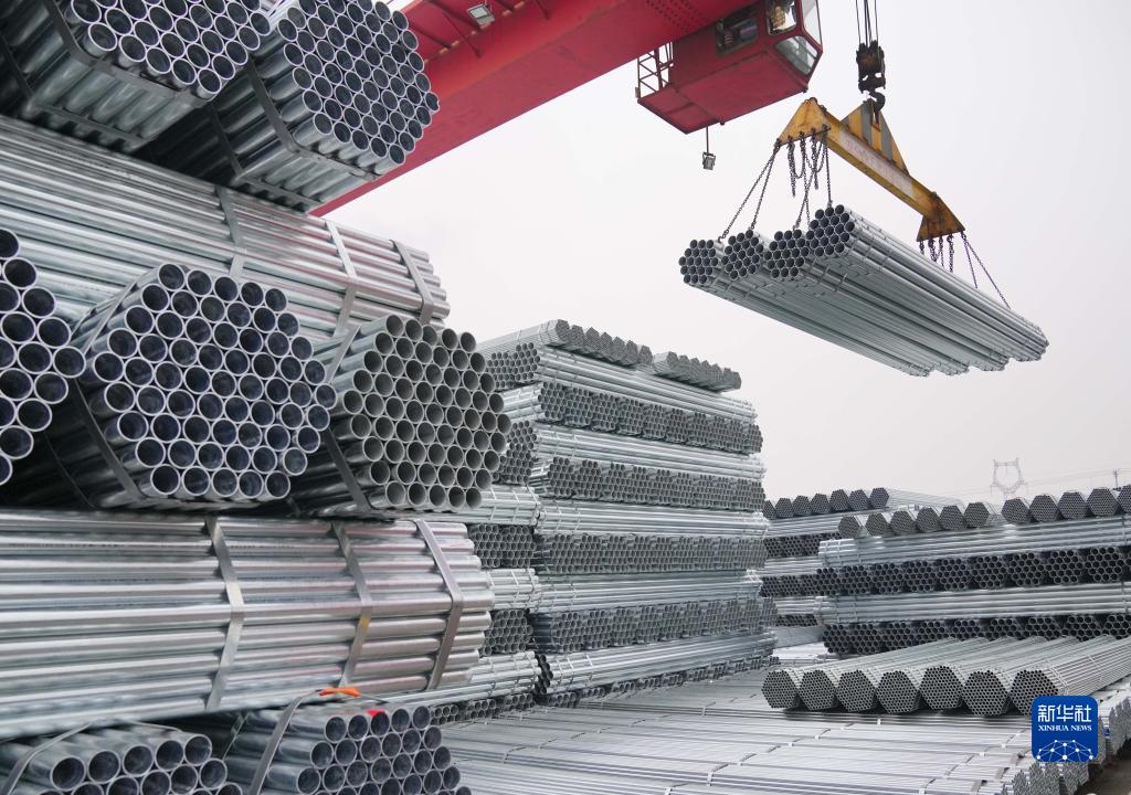 河北省遷安市一家鍍鋅管生產(chǎn)企業(yè)的工人操作機(jī)械設(shè)備吊運(yùn)鋼管(2021年12月11日攝)。新華社記者 楊世堯 攝
