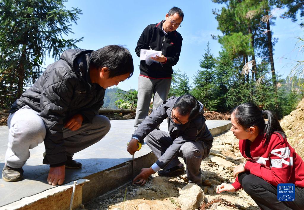 在廣西柳州市融水苗族自治縣良寨鄉(xiāng)培洞村,紀(jì)檢監(jiān)察干部(右一、二、三)在檢查扶貧道路施工情況(2019年11月5日攝)。新華社記者 黃孝邦 攝
