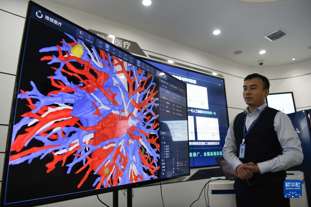 2021年12月24日,工作人員在位于安徽省合肥市西郊的中國聲谷體驗(yàn)中心內(nèi)介紹一款智慧醫(yī)療產(chǎn)品。新華社記者 張端 攝