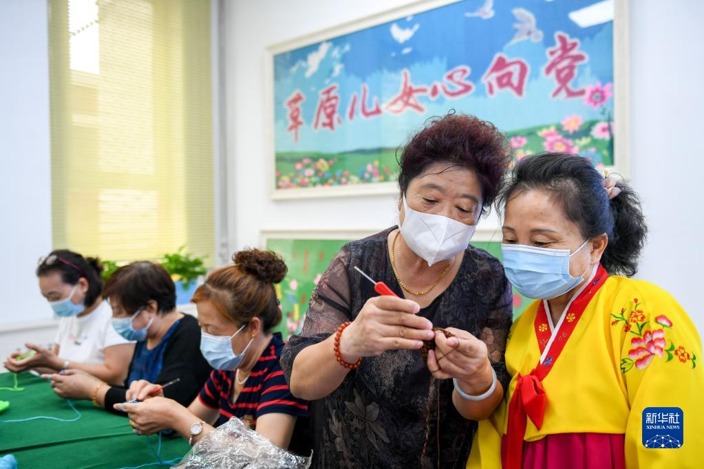 內蒙古赤峰市興安街道臨潢家園社區(qū)居民柳桂俠(右二)為民族技藝傳承班的學員講解編織技巧(2021年8月31日攝)。新華社記者 貝赫 攝
