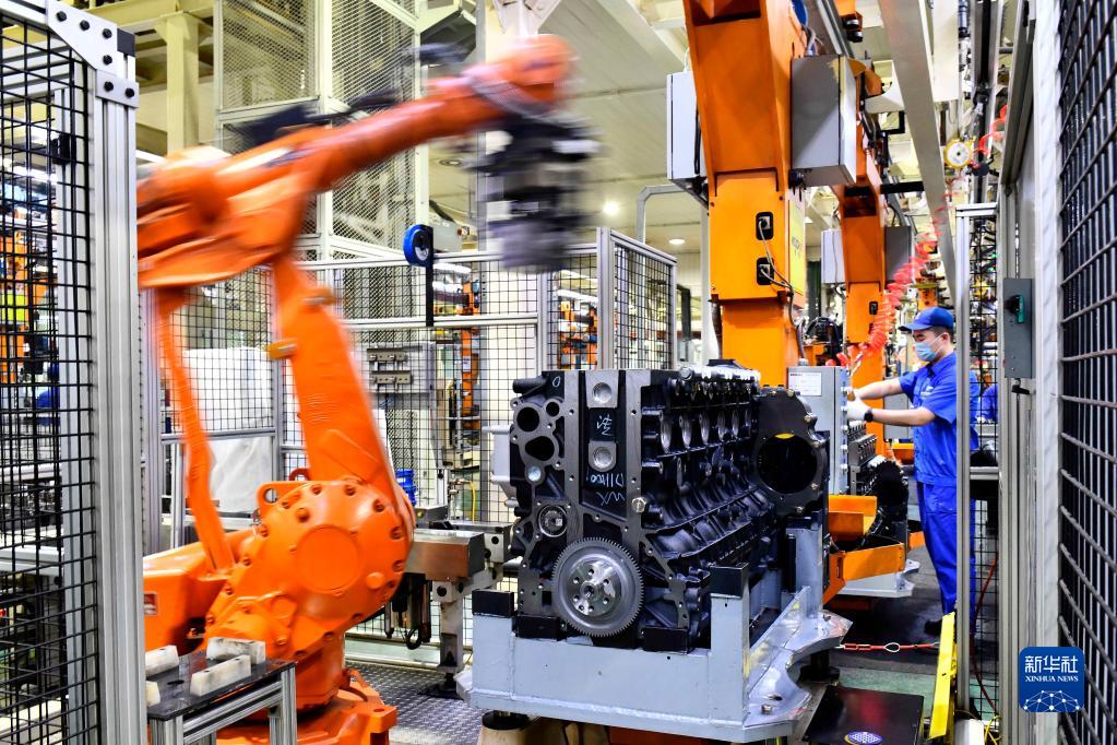 在位于山東濰坊的濰柴集團(tuán)總裝車間,機(jī)器人在流水線上裝配發(fā)動機(jī)(2021年4月22日攝)。新華社記者 郭緒雷 攝