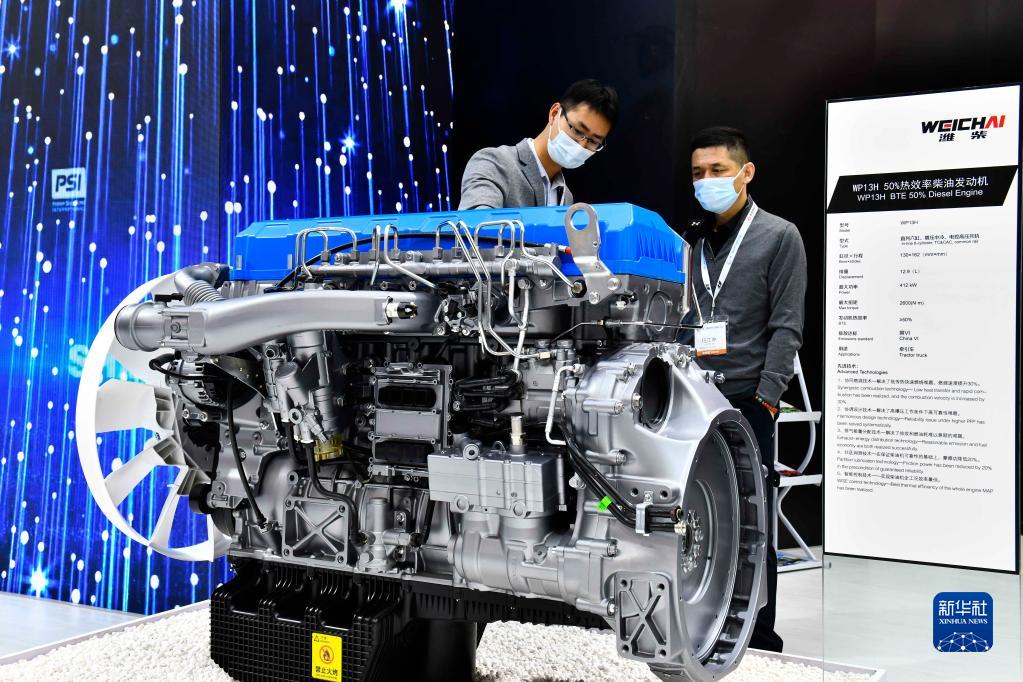 在山東濟(jì)南召開的第二屆世界內(nèi)燃機(jī)大會上,濰柴集團(tuán)展示的高熱效率柴油發(fā)動機(jī)(2021年4月21日攝)。新華社記者 郭緒雷 攝
