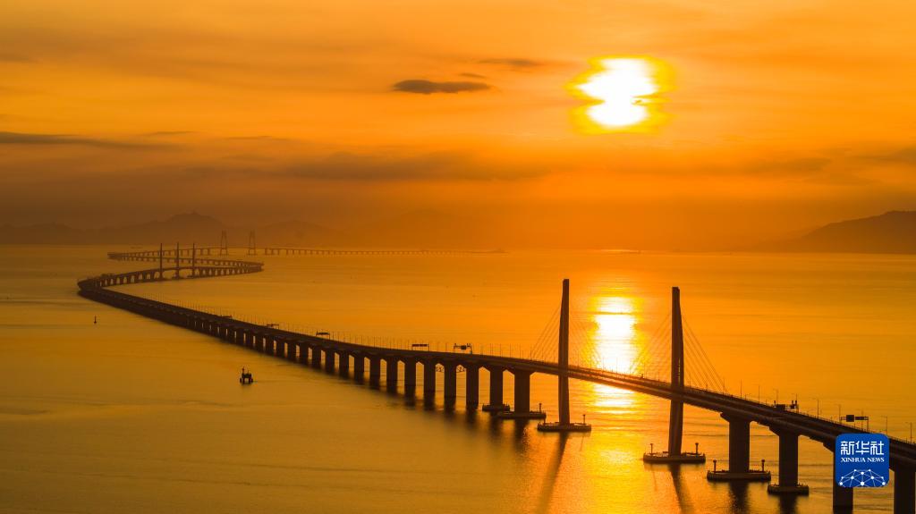 港珠澳大橋海上日出(2019年8月7日攝,無(wú)人機(jī)照片)。新華社發(fā)