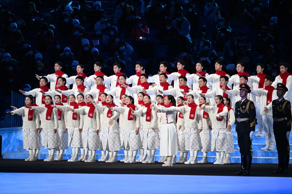 2022年3月4日晚,北京冬殘奧會開幕式上,中國殘疾人藝術(shù)團團長邰麗華帶領數(shù)十名殘疾人表演者用手語“唱”國歌。