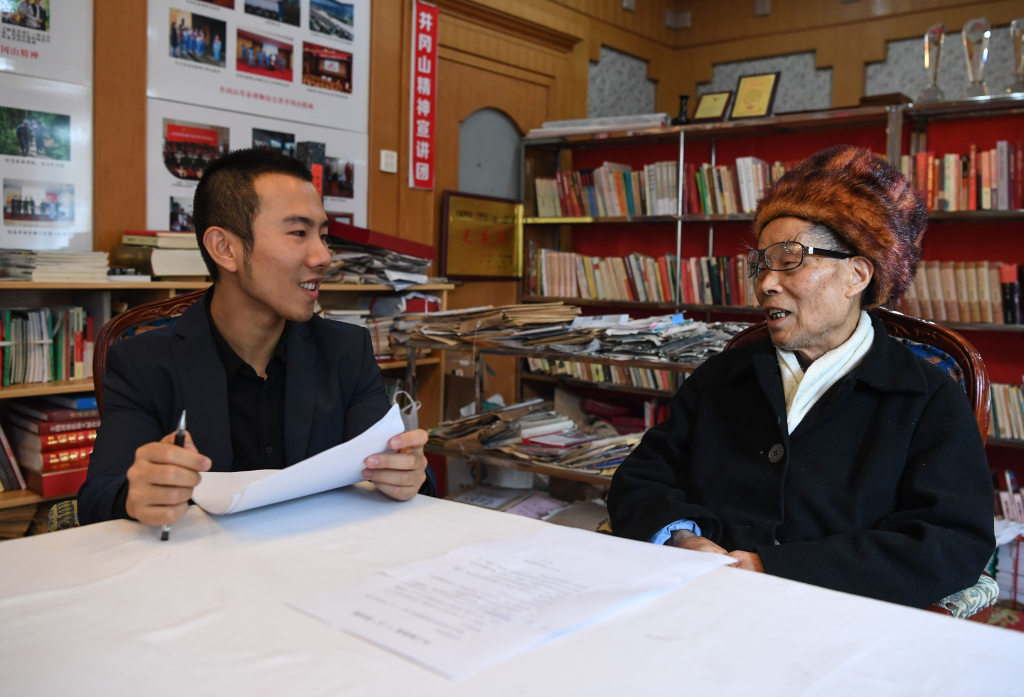 毛秉華(右)生前和孫子毛浩夫?qū)W習(xí)、探討井岡山革命歷史。新華社記者申宏攝