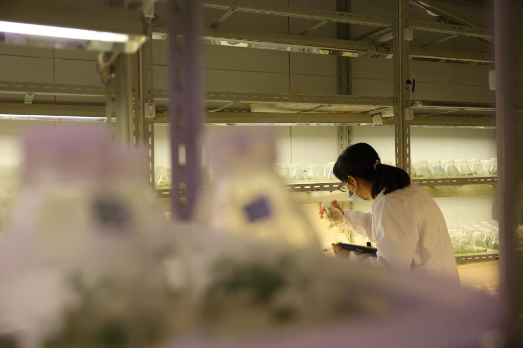 6月4日,毛英在組培室查看培養(yǎng)基內(nèi)丁香繁育情況。(新華社記者李寧 攝)