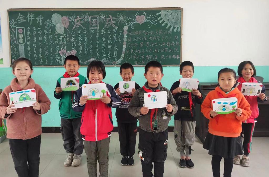 田原小學(xué)的孩子們正在展示走教老師教他們畫的孔雀。受訪者供圖